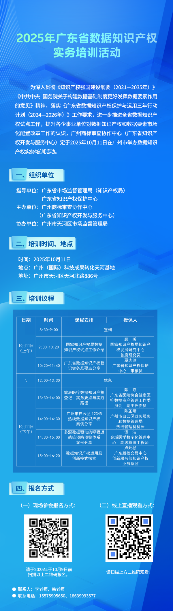 受今年第18号台风“桦加沙”影响,根据广东省防汛防旱防风总指挥部最新工作指引,为切实保障所有参会人员的出行安全,原定于2025年9月24日(周三)举办的“2025年广东省数据知识产权实务培训活动”将延期至2025年10月11日(周六)举办,其他事宜不变,具体安排如图所示。