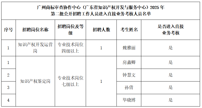 根据《广东省事业单位公开招聘人员办法》及《广州商标审查协作中心(广东省知识产权开发与服务中心)2025年第二批公开招聘工作人员公告》,我中心已完成资格审查工作。现将进入直接业务考核人员名单予以公告。